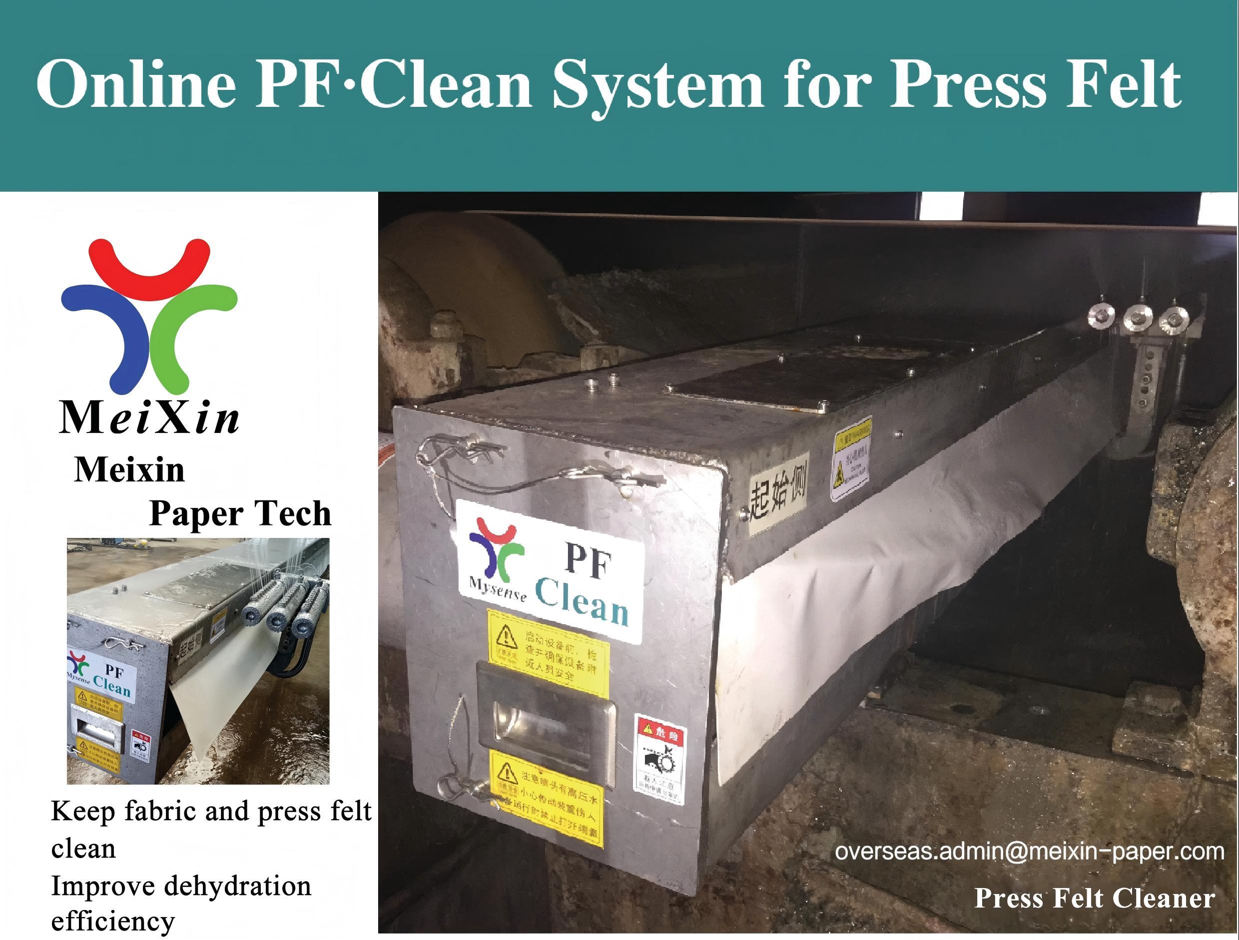 Meixin smart wet fabrics online cleaning system: After high performance filtration of cleaning water, high pressure water is generated by the high pressure pump station; the online cleaner is equipped with a high efficiency cleaning head that can move in a horizontal direction,the movement of the cleaning head is controlled by a PLC and the parameters are set by a visual touch screen. The cleaning head jets high pressure water at a certain angle on the paper fabric or the vacuum roll surface to clean the fabric or the vacuum roll to ensure normal cleaning and production.