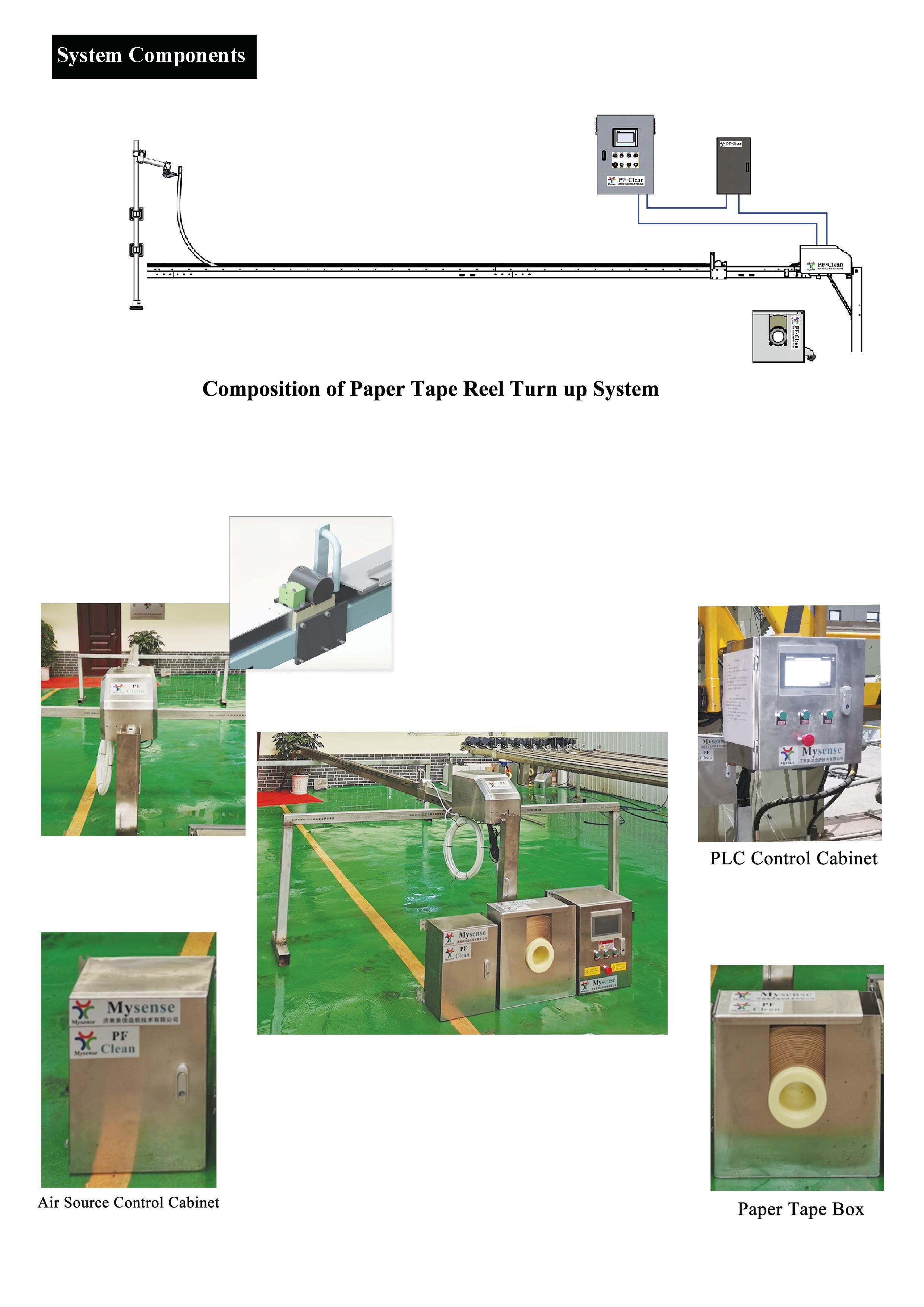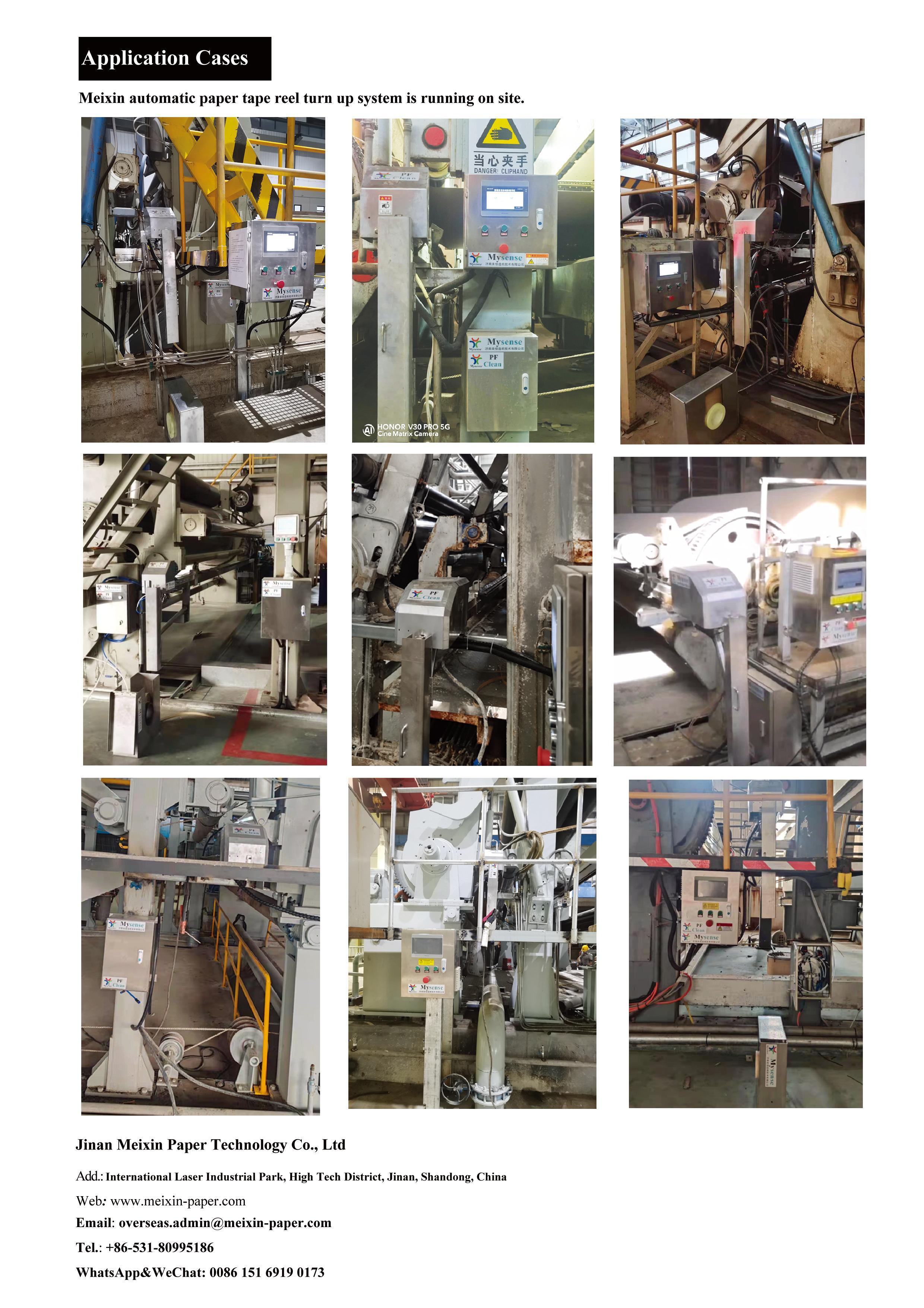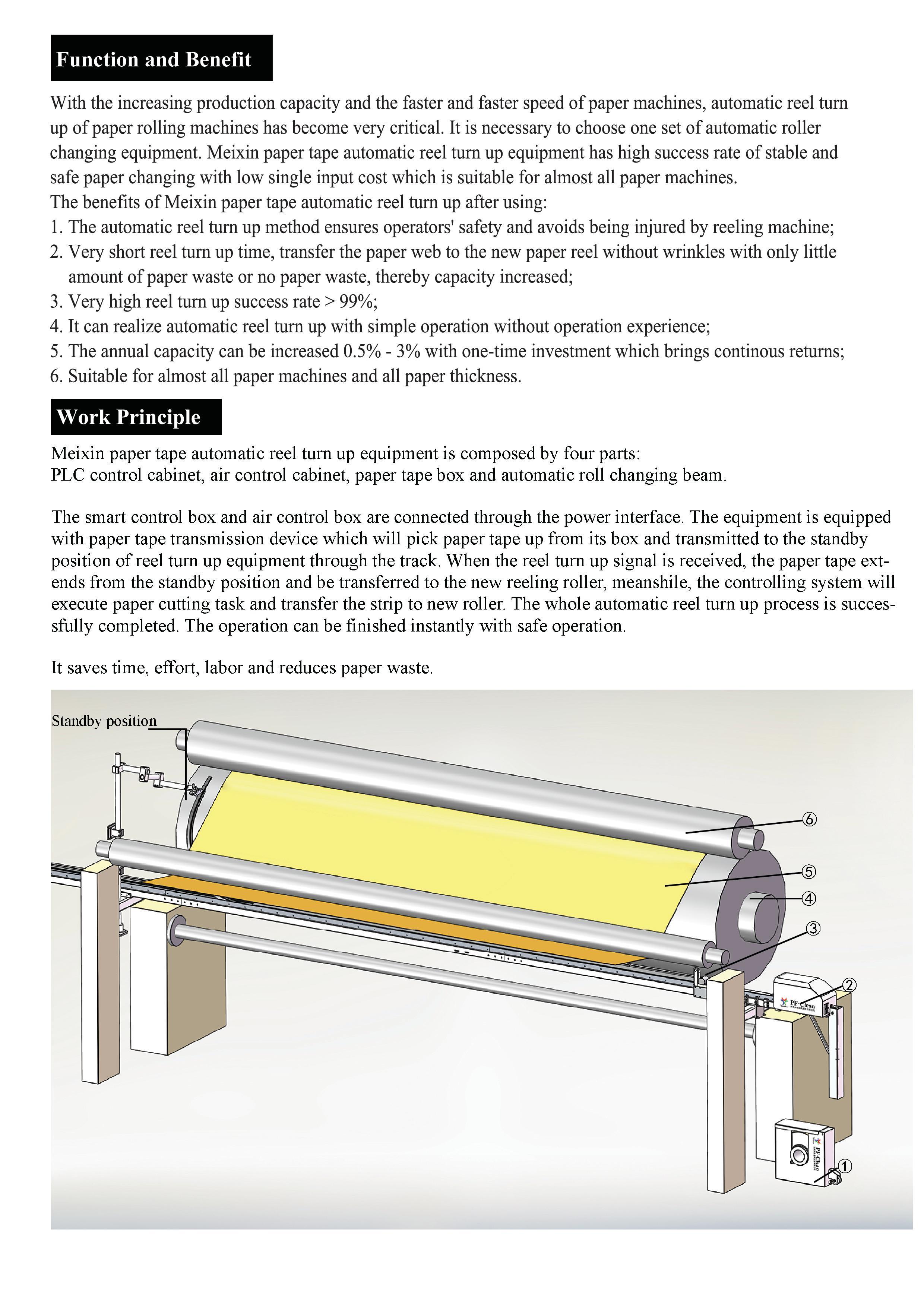 Meixin paper tape automatic reel turn up equipment is composed of four parts: PLC control cabinet, air control cabinet, paper breaking tape box, and automatic paper changing beam. The smart control box and pressure control air box are connected through the power interface. The equipment is equipped with a paper tape transmission device. The paper tape is picked up from the carton and transmitted to the standby position of reel turn up equipment through the track. When the reel turn up signal is received, the paper tape extends from the standby position and is transferred to the new reeling roller. At the same time, the sensor is operated to synchronise the transfer of the sheets to the new roll and the automatic roll change is successfully completed. The reel turn up can be finished instantly, the operation is safe. It saves time, effort and labor, and reduces paper waste.