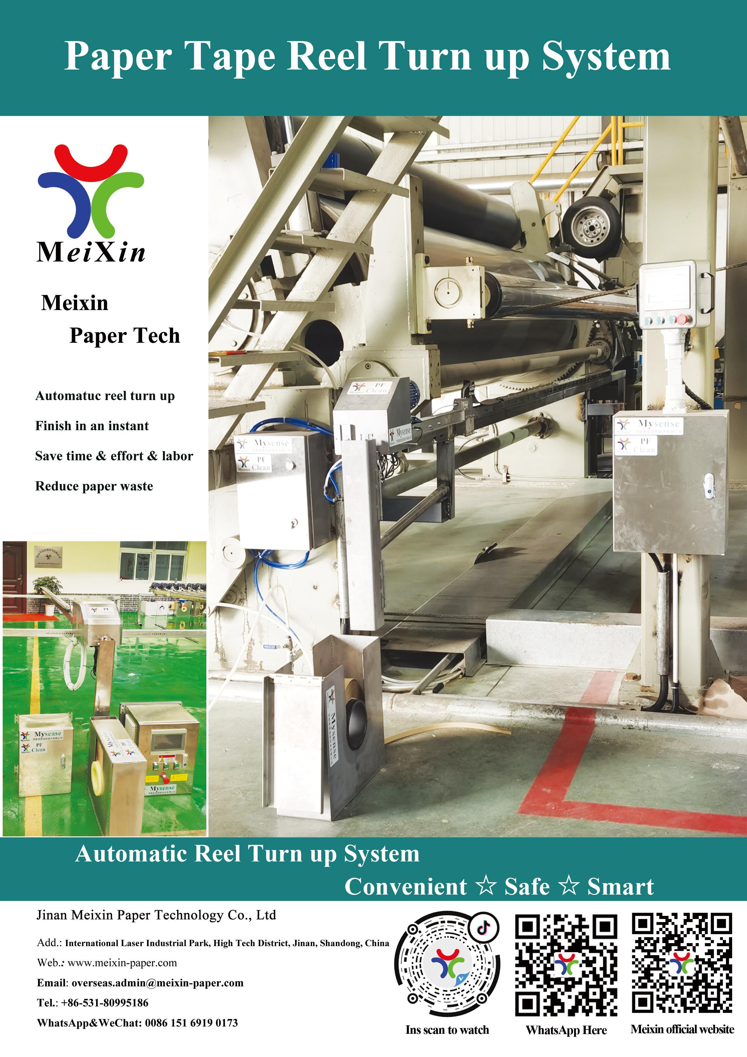 With the increasing production capacity of paper machines and the faster and faster speed, the automatic reel turn up of paper rolling machines has become very critical, and it is inevitable to choose a set of automatic roll changing equipment. Meixin paper tape automatic reel turn up equipment has high success rate of stable and safe paper changing and low single input cost, which is suitable for almost all paper machines. The benefits of Meixin paper tape automatic reel turn up after using: